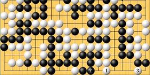 「幽玄の間」高段者の囲碁局面図。8段戦より。 上辺のコウの代償に黒1,3連打! 手順は省きますが、白の大石への攻めの効果で 白5子をもぎとり、 中央に黒地が出現。 観賞して引きこまれた碁でした。