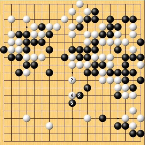 「幽玄の間」高段者の囲碁局面図。 黒5とハネましたが、 白に割り込まれると・・・