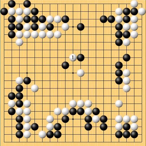 「幽玄の間」高段者の囲碁局面図。 相当の棋力でない打てない布石。 黒、超足早!(結果は135手、黒中押し!)