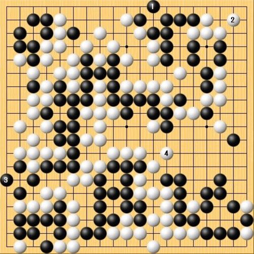 「幽玄の間」プロの囲碁局面図。 リアル観戦・・・黒の大石が危なく見えましたが… 黒1が利き、先手で黒9の大場に!