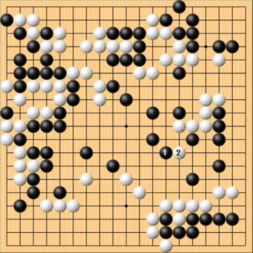 「幽玄の間」プロの囲碁局面図。 盤面中央、大コウ! 黒1キリに白2と抜いて景色が一変・・・ しかし勝負は黒中押し勝ち! 左辺の白が…